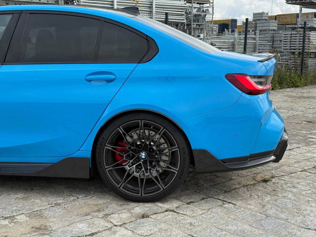 Po montażu auto zyskało jeszcze bardziej sportowy i dynamiczny wygląd, a carbonowe dodatki doskonale komponują się z muskularną sylwetką M3 G80. Detale z włókna węglowego podkreślają agresywny charakter tego modelu, przyciągając spojrzenia na drodze i dodając mu unikalnego stylu.